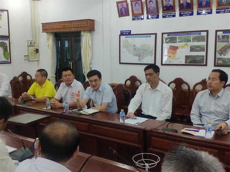 楊宏偉與中國駐老撾大使館經(jīng)濟(jì)商務(wù)參贊王其輝(右二)交流